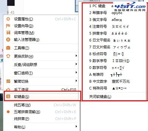 第一步:先呼出極品五筆輸入法的狀態欄,然后單擊鼠標右鍵,找到軟鍵盤