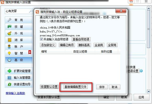 然后就會跳出這么一個框,點擊高級里面的自定義短語設置,如圖: