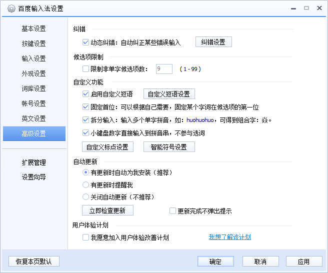 9、高級設置、糾錯、候選項限制、自定義功能、自動更新