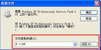 這時(shí)會(huì)出現(xiàn)一個(gè)提示框讓你安裝,這時(shí)只要把系統(tǒng)的安裝盤(Windows XP 安裝盤)放入光驅(qū)里, 沒有的可以下載I386這個(gè)壓縮包,并解壓。
