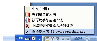 安裝后在輸入法語言欄切換至“CH”,再將鍵盤切換至“泰語輸入法”就可以輸入泰文了。如下圖所示。