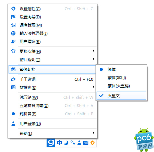 隨著互聯網的高度普及,火星文隨著網游等渠道進入大陸,且受到越來越多年輕用戶的追捧,為了打出火星文,他們將漢字輸入到特定的火星文轉換器中來實現輸入,這其實非常不方便。為了滿足這批年輕用戶的需求,光速輸入法將火星文輸入功能也集成到軟件中,右擊輸入法狀態欄,選擇繁簡切換,再選擇火星文輸入即可完成設置。