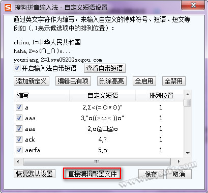 我們來將其編輯為【yo,1=喲】“yo”對應的是我們打出的拼音,“1”是對應的是序號1(用“,”將拼音和序號隔開),“=喲”就是第一個選項的選擇結果了。我們依次排列下去,點擊保存。