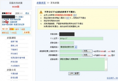 2、使用搜狗通行證登陸搜狗拼音輸入法官網皮膚頁面,點擊上傳皮膚,按照提示填寫信息,及上傳皮膚及效果圖。效果圖是向網友展現你皮膚的一個重要途徑,在皮膚審核時,效果圖與皮膚無關將無法通過審核。