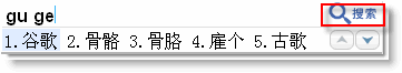 用戶可以在使用谷歌拼音輸入字詞的同時使用 Google 搜索直接搜索候選項。當輸入時,用戶用鍵盤的"上"" 下"箭頭鍵選擇候選字詞,然后按下"Ctrl-G"即可打開搜索網頁。同樣,您可以使用鼠標右鍵點選候選字詞,然后點擊搜索按鈕。例如,如果您要搜索"谷歌",請鍵入"guge",屏幕上將出現: