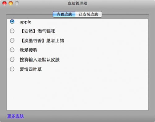 此功能,不知搜狗啥時候加可能是搜狗為了打差異化的牌吧,這樣一個版本里,連字體大小都不能設置,但卻加入了換皮膚的功能,我想要是輸入法來個投標的話,搜狗的這一個換膚功能就可以將所有其他mac輸入法干出局了,內置了幾個皮膚,
