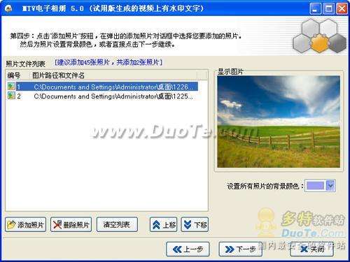 接下來進入添加照片界面(如圖5),點擊“添加照片”按鈕,在彈出的添加文件對話框中選中您要添加的照片,可以按住鼠標左鍵拖動選擇多張照片批量添加,點擊“打開”即可添加進去。然后設(shè)置照片的背景顏色,如果想調(diào)整照片的順序,可以在圖片列表中選中圖片,點擊下面的“上移”或“下移”按鈕進行調(diào)整,最后點擊“下一步”按鈕