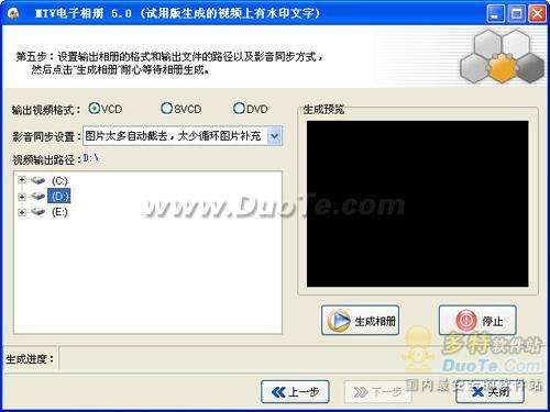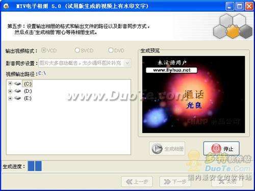 最后選擇輸出視頻格式VCD/SVCD/DVD、輸出路徑和影音同步方式,然后點擊“生成相冊”按鈕(如圖6),就可以等待您親自導(dǎo)演的MTV電子相冊生成完畢。