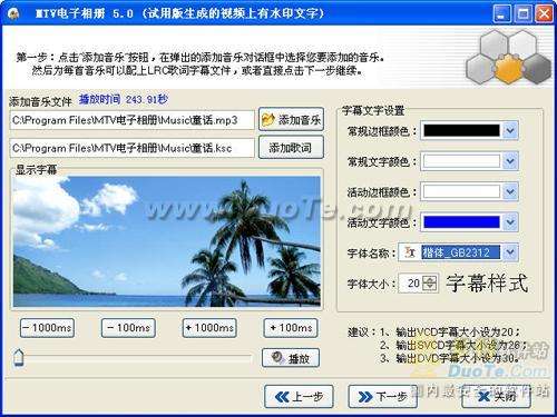 點擊主界面中的“制作卡拉OK相冊”按鈕,進入添加音樂界面(如圖2),點擊“添加音樂”按鈕,添加您喜歡的歌曲。如果在歌曲同一目錄下存在著歌詞文件,將自動添加進去。您也可以點擊“添加歌詞”按鈕自己添加。添加完成后設(shè)置字幕文字的字體、大小。然后就點擊“播放”按鈕進行試聽,如果您發(fā)現(xiàn)歌詞顯示不同步,可以點擊歌詞顯示區(qū)下面的四個按鈕來調(diào)整。“-1000ms”按鈕把歌詞整體后移1000ms;“—100ms”按鈕把歌詞整體后移100ms;“+1000ms”按鈕把歌詞整體前移1000ms;“+100ms”按鈕把歌詞整體前移100ms。 完成設(shè)置后點擊“下一步”按鈕。