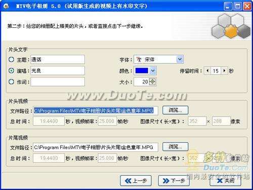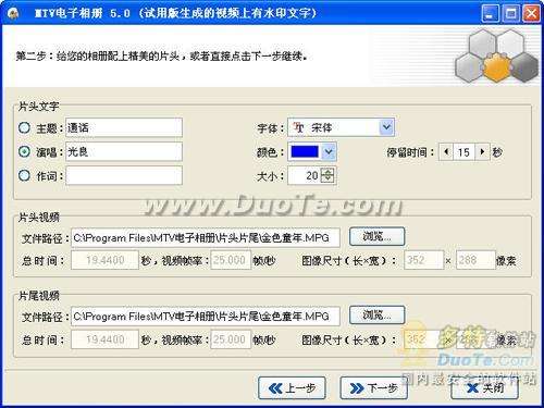 接著進入添加片頭片尾視頻界面(如圖3),在此可以點擊“瀏覽”按鈕為您的相冊配上精美的片頭片尾視頻,任何AVI、DAT、MPG視頻都可以作為片頭尾,還可以設(shè)置片頭文字,設(shè)置完成后點擊“下一步”按鈕