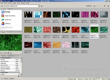 同Adobe其他產(chǎn)品一樣,現(xiàn)在 After Effects 7.0 中也包含了Bridge工具。Bridge可以幫助用戶操作和查找項目文件、多媒體文件以及動畫預(yù)設(shè)。在Bridge里面,我們可以預(yù)覽到動畫預(yù)設(shè)和模板的效果,我們看到的預(yù)覽與最終應(yīng)用到項目中的效果是一致的。有了這樣的功能,我們就可以在決定是否使用某個預(yù)設(shè)或模板前方便的看到最終應(yīng)用的效果了。