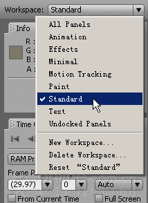 我們可以調(diào)整改動預(yù)設(shè)的工作區(qū)布局,并且系統(tǒng)會記住這些改動,在下次起動時, After Effects 7.0 將布局原封不動的顯示出來。如果搞亂了工作區(qū)的面板布局,我們還可以通過工作區(qū)下拉菜單的“重置”命令將選定的預(yù)設(shè)工作區(qū)還原回初始狀態(tài)。