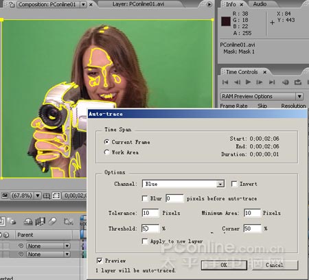 自動追蹤是一個自動在位圖圖像上創(chuàng)建蒙板的重要工具。 After Effects 7.0 中的自動追蹤也經(jīng)歷了一些變化,從而使其精確性得到了增強。之前版本的自動追蹤工具利用線性分割創(chuàng)建蒙板,而 After Effects 7.0 中改進(jìn)的自動追蹤功能則使用了基于Illustrator CS2追蹤功能而來的貝塞爾曲線分割創(chuàng)建蒙板。