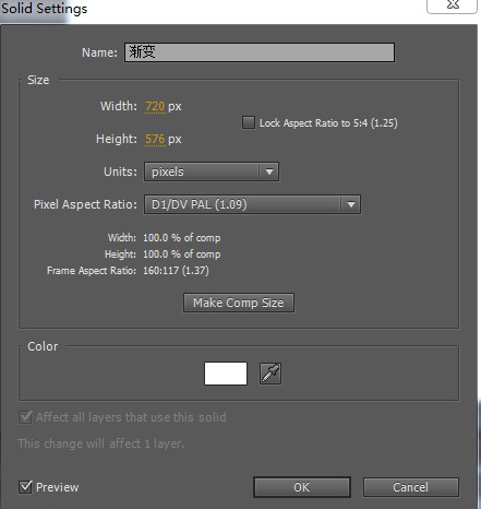 執行菜單中的Layer(圖層)New(新建)Solid(固態層)命令,打開Solid Settings(固態層設置)對話框,設置Name(名字)為“漸變”,Color(顏色)為白色。