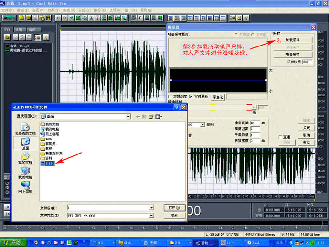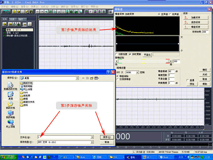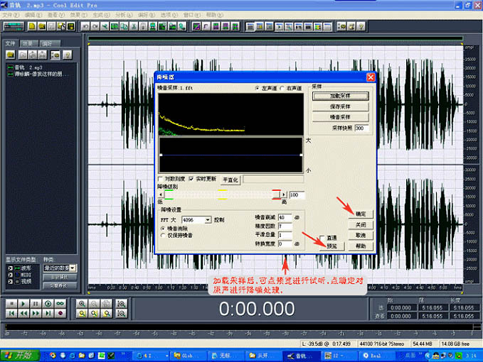 8. 回到處于波形編輯界面的人聲文件,打開降噪器,加載之前保存的噪聲采樣進行降噪處理,點確定降噪前,可先點預覽試聽一下降噪后的效果(如失真太大,說明降噪采樣不合適,需重新采樣或調整參數,有一點要說明,無論何種方式的降噪都會對原聲有一定的損害) (圖 13 圖 14 圖 15 )