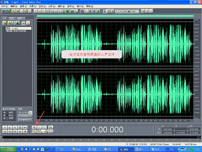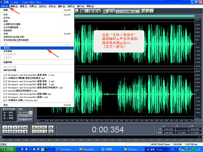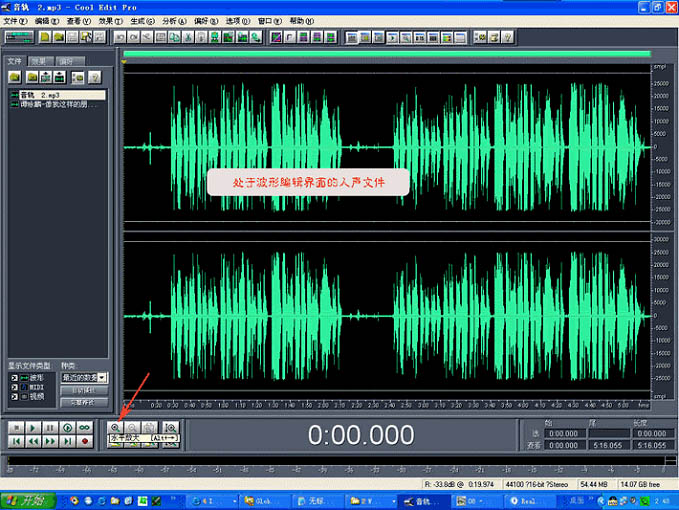 5 、雙擊音軌 2 進入波形編輯界面(圖 5 ),將你錄制的原始人聲文件保存為 mp3pro 格式(圖 6 圖 7 ),以前的介紹中是讓大家存為 wav 格式,其實 wma/mp3 也是絕對可以的,并且可以節省大量空間。