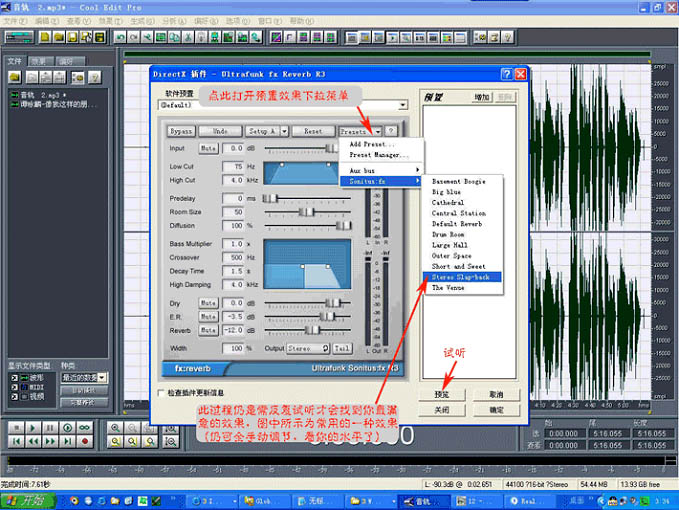 2. 加載預置下拉菜單中的各種效果后(也可手動調節)點右下方的 “ 預覽 ” 進行反復的試聽,直至調至滿意的混響效果后,點確定對原聲進行混響處理,常用的效果如圖中所示(圖 22 圖 23 )。