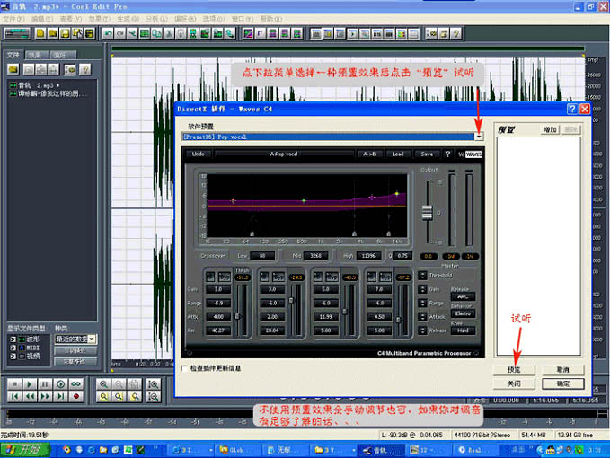 2. 加載預置下拉菜單中的各種效果后(如果你對數字音頻有足夠了解的話,也可手動調節)點右下方的 “ 預覽 ” 進行反復的試聽,直至調至滿意的效果后,點確定對原聲進行壓限處理(圖 20 )。
