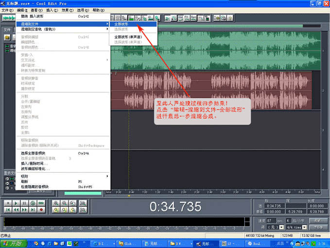 1.點“編輯--混縮到文件--全部波形”便可將伴奏和處理過的人聲混縮合成在一起(圖24)。