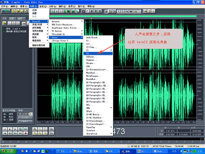 1. 點擊 “ 效果 --DirectX--Waves--C4” 打開 WaveC4 壓限效果器(圖 19 )。