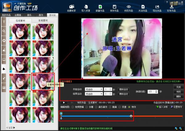 step5:現在我們就給視頻添加【燈光】特效,點擊素材庫,進入素材庫選擇【燈光】欄。選擇自己喜歡的燈光效果,通過左鍵拖動到右邊編輯區域(或者鼠標左鍵點擊)即可看到效果。添加了燈光特效之后可以對燈光特效進行再次編輯。時間軸上拖動顯示位置和時間長短,開始運動方式和結束運動方式,持續時間,一切編輯完后可以預覽。