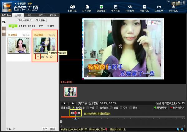 step4:導入素材或者拍攝好素材之后我們就可以對視頻素材進行編輯處理。將視頻素材從素材主畫面拖動到右邊的編輯區域,即可對改素材進行編輯處理。也可以點擊主畫面里的視頻縮略圖下面的[+]添加編輯。添加之后在時間軸上進行拖動,選取播放時間區域。