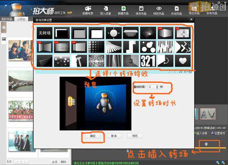 第6步:【轉場添加】如下圖6,點擊插入轉場特效,選擇1個特效預覽效果,設置播放時間,確認完成。