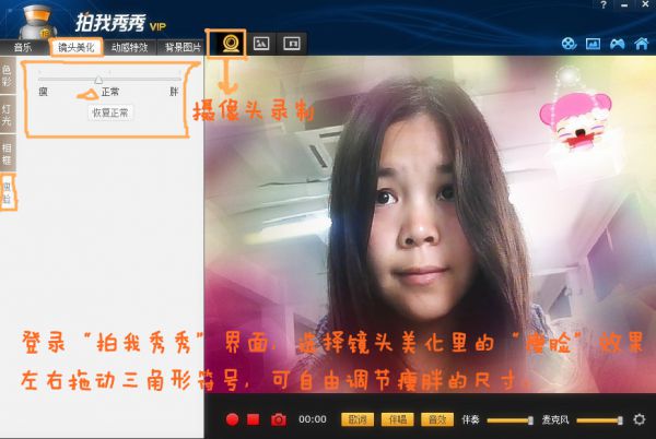 “拍大師”是一款流行的視頻拍攝創作軟件,其中的“拍我秀秀”功能不僅可以錄制K歌視頻,還可以給直播或錄制中的視頻添加特效,軟件中“鏡頭美化”的 “瘦臉”特效,是最新開發的功能之一,通過左右拖動三角符號就可以在攝像頭里看到自己變瘦和變胖的樣子,同時我們還可以看著瘦瘦的自己對著攝像頭K歌、做鬼臉,如下圖1。