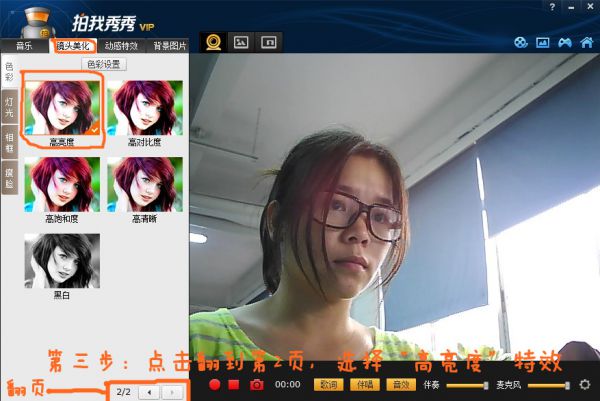 第三步:如下圖3,點擊翻到第2頁,選擇“高亮度”特效,鏡頭就變清晰很多了。