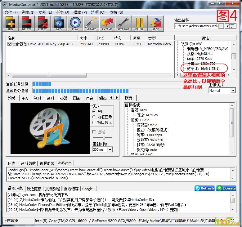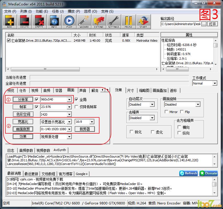 一部片源是1080P或者720P的標準格式影片的寬高比皆為16:9。但是有的片源也許會是12:5或者其他。如果還是按照 iPhone960x540 (iPad1/2@1024x576)分辨率壓縮的話就會拉長影像產生畫面比例失真,假設以片源寬高比12:5為例,按照圖3第②項選擇“設置顯示寬高比”并且固定寬高比為16:9,并且畫面剪裁設置為0:-140:1920:1080,因為片源是1920x800@12:5的分辨率,要還原成16:9 必須上下都加一道140像素的黑邊才能變成1920x1080@16:9的標準比例,其他不標準分辨率影片按照以上方法依次類推。