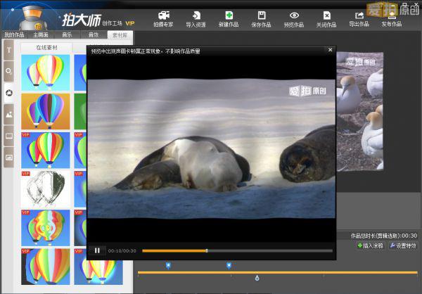 stpe2:視頻素材導入到拍大師之后,我們選擇就對改視頻進行編輯,將主畫面的視頻素材拖到右邊編輯區域。拖到編輯區域之后我們可以后,我們在時間軸上,將時間軸拖到最后,保證視頻全部時間都有。