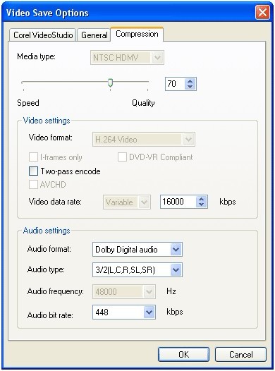 注意:您可能會注意到,“常規”和“壓縮”選項卡中的其他選項灰顯或被禁用。會聲會影已自動禁用這些選項,并在您選擇AVCHD作為輸出格式時將這些選項設置為AVCHD視頻的標準設置。