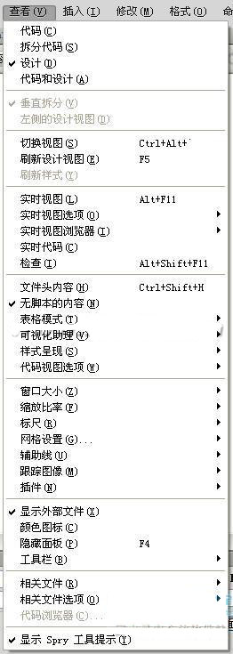 “查看”菜單 使您可以看到文檔的各種視圖(例如“設計”視圖和“代碼”視圖),并且可以顯示和隱藏不同類型的頁面元素和 DW工具及工具欄。