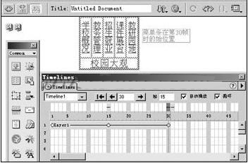 1、選定層面,當(dāng)鼠標(biāo)變成“十”字形時按住左鍵將層面拖動到頁面右上角(使整個菜單條完全露出但上邊緣正好靠攏頁面上邊界),在窗口菜單中打開時間線面板,選定層面將其拖動到時間線上,Dreamweaer會自動產(chǎn)生一個長度為15幀的動畫對象,拖動該動畫對象的最后一個關(guān)鍵幀到第30幀,將其長度設(shè)置為30幀。然后在第15幀處單擊右鍵,在彈出的快捷菜單中選擇“添加關(guān)鍵幀”選項插入一個關(guān)鍵幀,并將層面拖動到適當(dāng)位置(如圖2)。