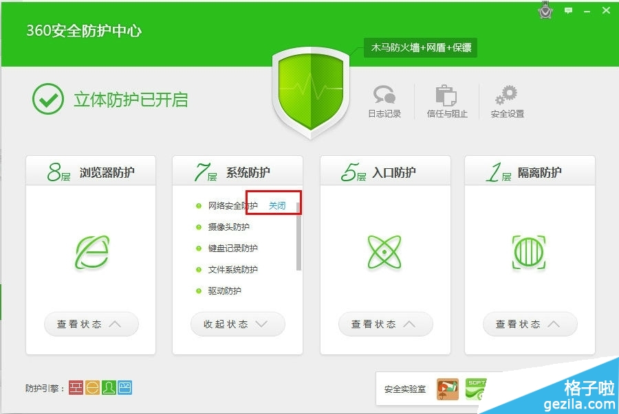 單擊未開啟的防護旁的“開啟”;即可開啟相應防護,小編的是已經開啟的,所以顯示的就是關閉