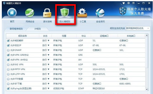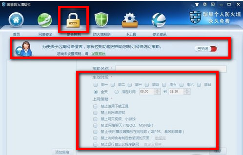 這個功能很多家長應該非常喜歡哦!瑞星個人防火墻本次升級還優化了“家長控制”功能。家長可以自行制定網絡訪問策略,禁止運行某些聯網程序,更好地控制了網頁瀏覽及下載行為。有了這項功能可以防止孩子沉迷網絡,防止不良頁面對未成年人的侵害。是家長的好幫手!
