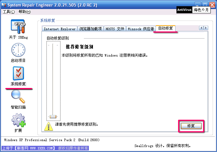 默認為“推薦修復級別”,修復所有已知Windows注冊表相關錯誤,點擊“修復”按鈕進行修復。