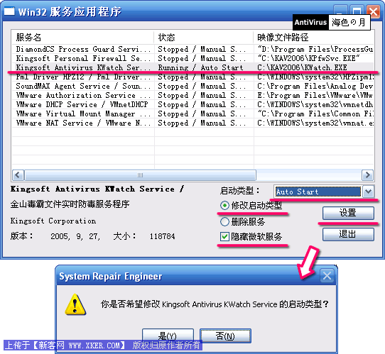 首先在列表中點擊選擇一個需要調整啟動類型的服務,然后點選“修改啟動類型”,再到“啟動類型”下拉列表里選擇需要調整到的啟動類型:“Auto Start”、“Manual Start”或“Disabled”,最后點擊“設置”按鈕,出現確認對話框,點擊是確認,點擊否取消。