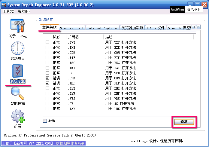 SREng 會自動判斷所列文件關聯是否正常,如果不正常會在“狀態”列顯示“錯誤”字樣并自動勾選,點擊“修復”按鈕即可修復。