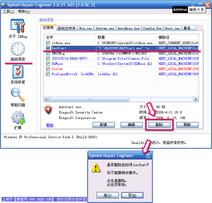 要刪除一個注冊表啟動項,點擊選擇一個需要刪除的注冊表啟動項目,然后點擊“刪除”按鈕,出現刪除確認對話框,點擊是刪除,點擊否取消。