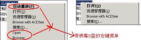 shell=Auto修改上下文菜單。把默認項改為病毒的啟動項。但此時只要用戶在圖標上點擊右鍵,馬上發現破綻。精明點的病毒會改默認項的名字,但如果你在非中文的系統下發現右鍵菜單里多出了亂碼或者中文,你會認為是什么呢? 見圖2。