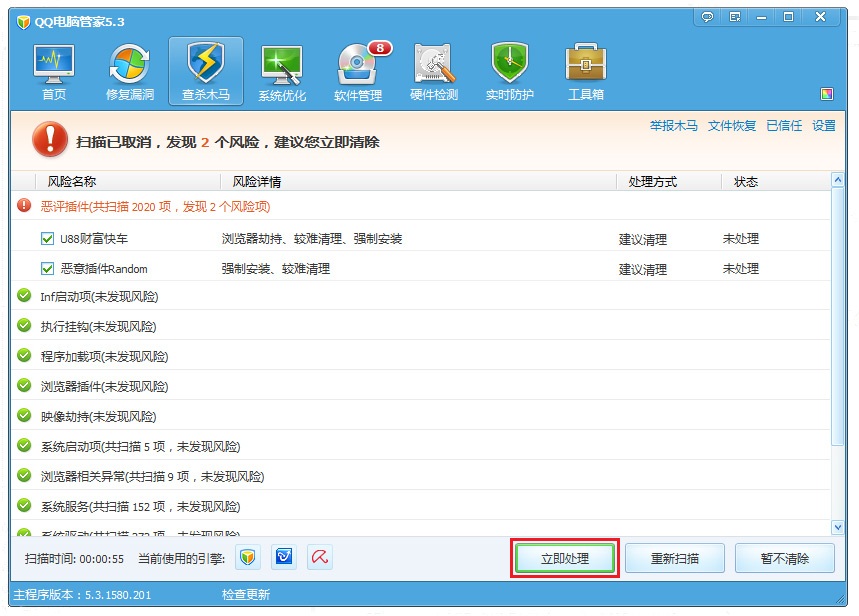 在三種掃描方式中,快速掃描的速度是最快的,只需短短1-2分鐘時(shí)間,QQ電腦管家就能為您系統(tǒng)中最容易受木馬侵襲的關(guān)鍵位置進(jìn)行掃描。