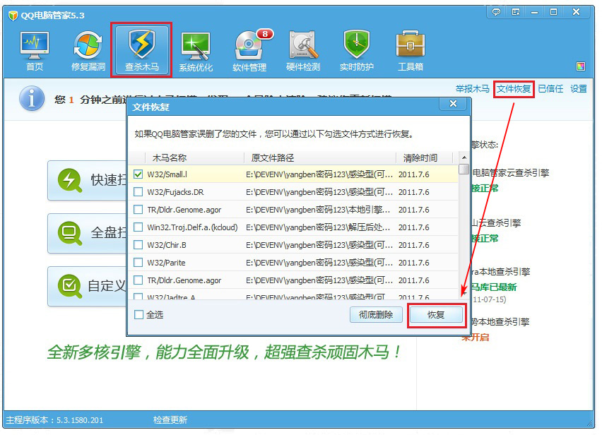 您可以點(diǎn)擊查殺木馬標(biāo)簽頁右上角的“隔離區(qū)”,在列表中選中想要恢復(fù)的文件,再點(diǎn)擊“恢復(fù)”按鈕,即可輕松恢復(fù)誤刪除的文件。