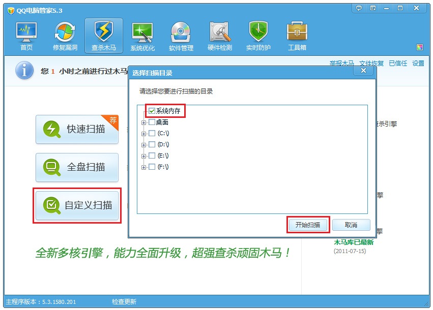 您可以通過自定義掃描設(shè)定需要掃描的位置,只需要在彈出的掃描位置選項(xiàng)框中勾選需要掃描的位置,再點(diǎn)擊“開始掃描”,QQ電腦管家就會(huì)按您的設(shè)置開始進(jìn)行掃描。