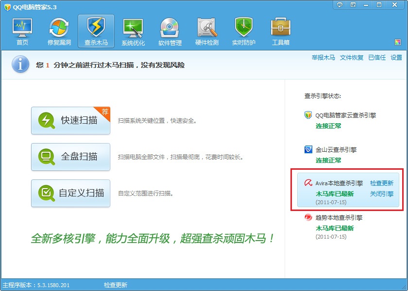 答:QQ電腦管家從4.5版本開始,引進(jìn)國際領(lǐng)先的本地查殺引擎,大大提高木馬查殺能力。您在安裝完QQ電腦管家后,即默認(rèn)開啟了雙引擎模式,同時(shí)病毒庫的也將自動(dòng)升級,讓您輕輕松松就能體驗(yàn)強(qiáng)大的木馬雙引擎查殺能力。