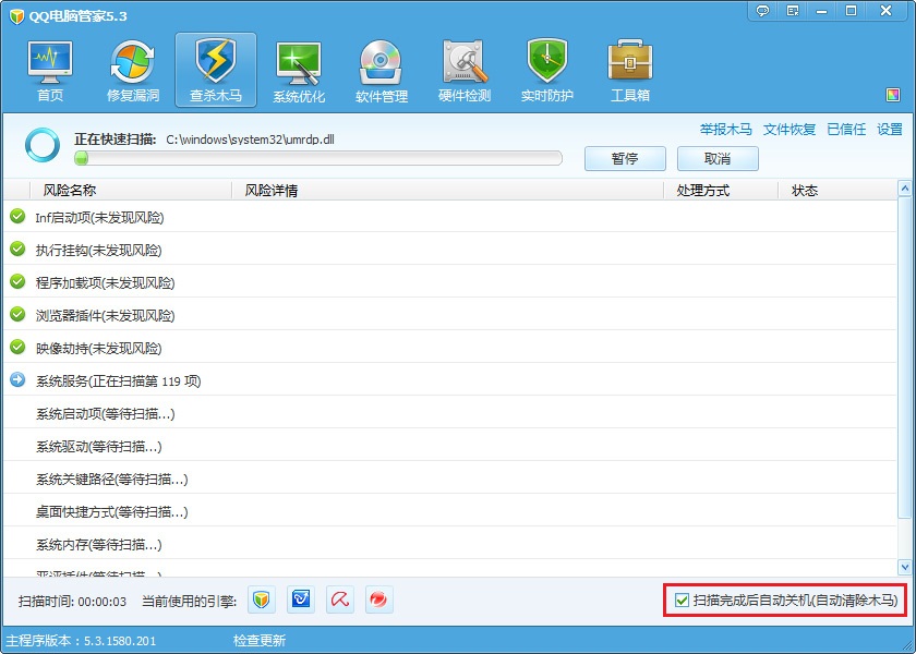 答:當(dāng)您使用木馬查殺的“全盤掃描”或“自定義掃描”時(shí),會(huì)在掃描界面的左下角出現(xiàn)“掃描完成后自動(dòng)關(guān)機(jī)”的選項(xiàng),您只要勾選了該選項(xiàng),QQ電腦管家就會(huì)在木馬掃描完成后,自動(dòng)清除發(fā)現(xiàn)的風(fēng)險(xiǎn),并且自動(dòng)關(guān)機(jī)。