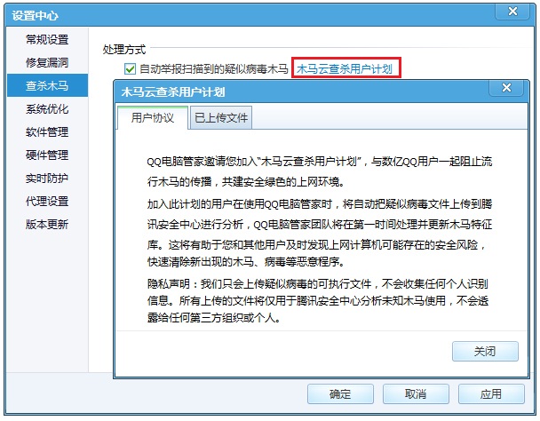 QQ電腦管家被安裝后,默認(rèn)用戶不參加此計(jì)劃,在明確告知用戶計(jì)劃內(nèi)容后,用戶可以自主選擇是否參加。對于拒絕參加計(jì)劃的用戶,QQ電腦管家不會(huì)自動(dòng)上傳此類未知文件。