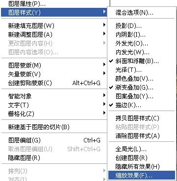 “縮放效果”命令隱藏在“圖層|圖層樣式”子菜單中,位于“圖層樣式”菜單的底部,如圖1所示。