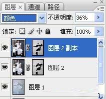 9、復制一層圖層2,將圖層2副本的混合模式設置為顏色,并將圖層的不透明度調協為“36%”左右,如下圖: