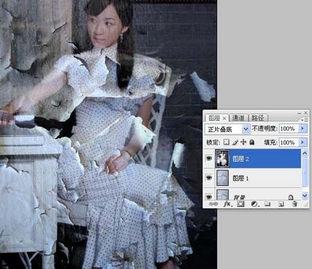3、接下來便是將圖層2的混合模式設置“正片疊底”,(這模式一般都能很容易合出一些好看的圖片)如下圖: